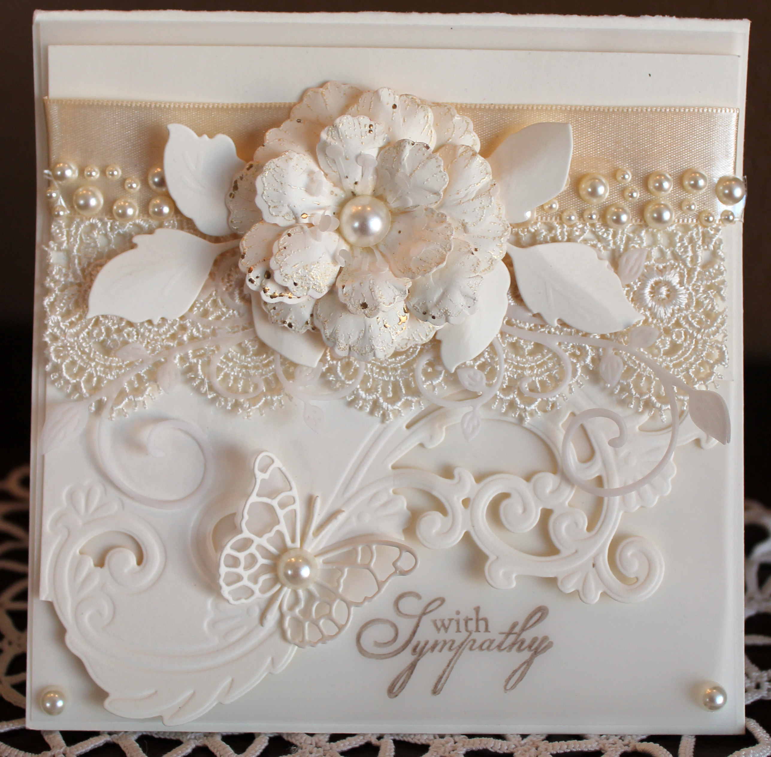 Directions: Your finished card will be 5 1/2″ x 7 1/2″. Cut white cardstock 11″ x 7 3/4″ score at 2 3/4″ and 9 1/4″ fold the sides into the middle. Put the Pavo die on the 2 1/4″ section and die cut. Repeat for other fold. Cut matching black sections. Emboss white cardstock with folder. Die cut Cheery Lynn wedding silhouette, mount to vellum. Using mounting adhesive, mount the wedding silhouette in the middle. Decorate with flowers and ribbons, tulle, and rhinestone bling. Die cut white side pieces with Pavo die, adhere. Cut a black matt for the backside 5 1/4″ x 7 1/4″ mount. Cut a white matt 5″ x7″ mount on top of black matt. This will create a lovely space for writing a special note. For the bellyband, cut a strip of white paper 11″ long and 1 1/2″ wide, wrap around- it will be about 2″ too short- cut a 4″ black piece and use a fancy border edge punch and trim both ends adhere to the white piece. Decorate the front with die cuts, vellum leaves, tulle and pearl floral pics, stamp your sentiment, layer your pieces and adhere. Put your belly band around your card and you are finished! 🙂